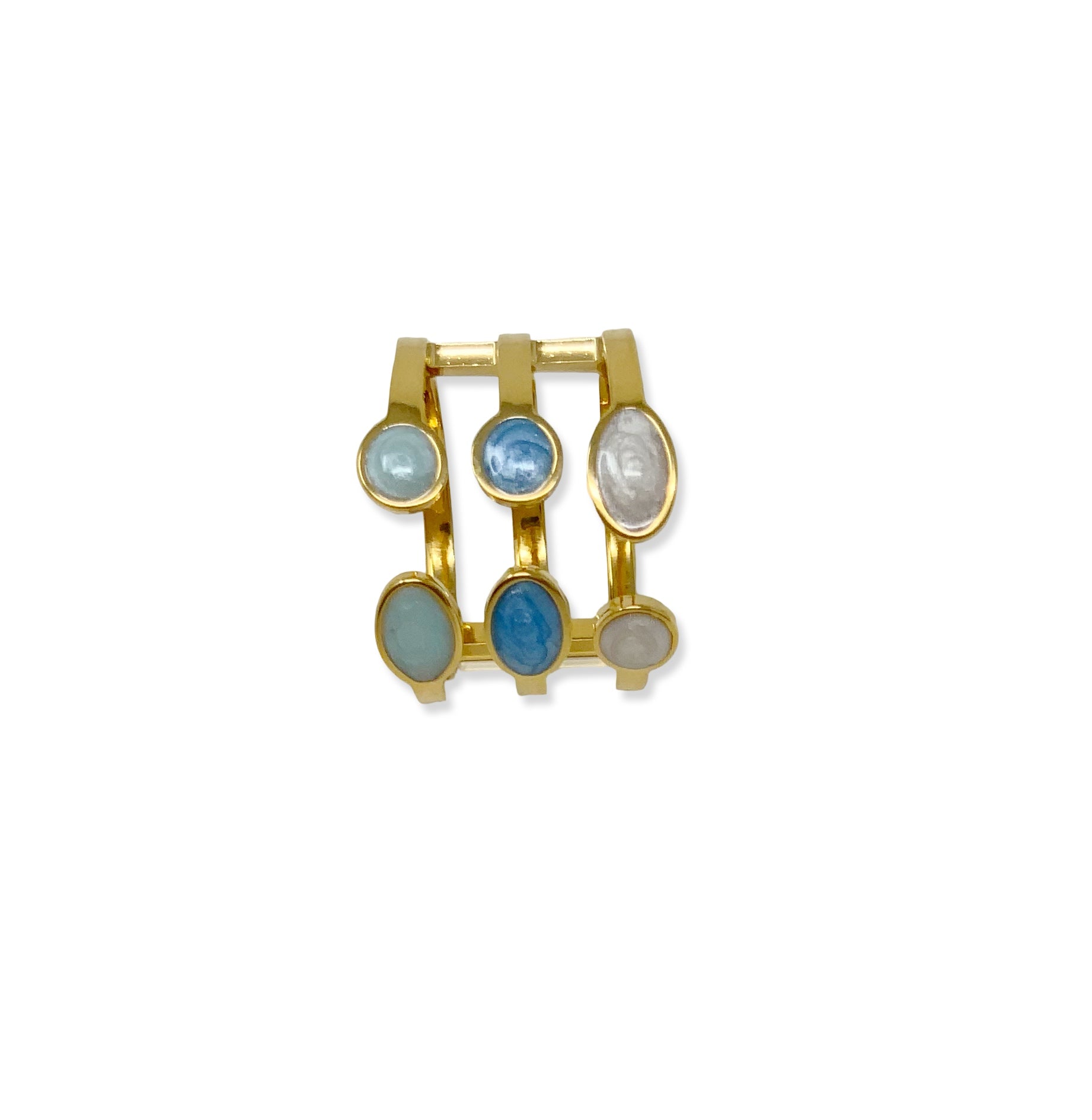 Realizzato in pregiato ottone, scelto per la sua resistenza e per la sua capacità di modellarsi in forme sinuose e confortevoli, questo anello a fascia tripla aperta combina design contemporaneo e richiami classici. La struttura aperta garantisce una vestibilitá confortevole e adattabile, mentre il gioco cromatico delle pietre degradé crea un punto luce magnetico. La finitura in oro 18 kt garantisce un colore ricco e prezioso. Questo anello è un gioiello scultoreo pensato per la donna che ama distinguersi con dettagli raffinati e materici.