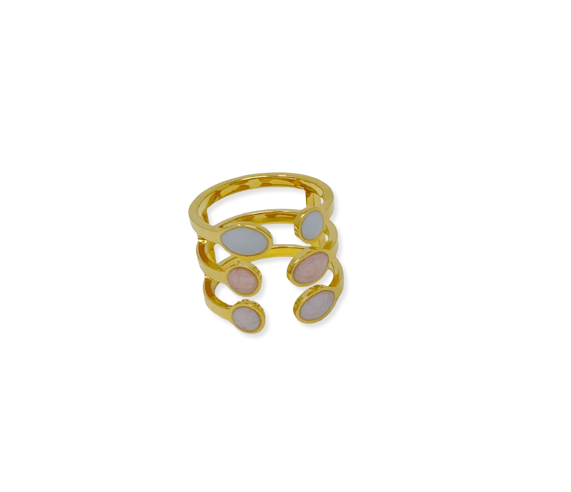 Realizzato in pregiato ottone, scelto per la sua resistenza e per la sua capacità di modellarsi in forme sinuose e confortevoli, questo anello a fascia tripla aperta combina design contemporaneo e richiami classici. La struttura aperta garantisce una vestibilitá confortevole e adattabile, mentre il gioco cromatico delle pietre degradé crea un punto luce magnetico. La finitura in oro 18 kt garantisce un colore ricco e prezioso. Questo anello è un gioiello scultoreo pensato per la donna che ama distinguersi con dettagli raffinati e materici.