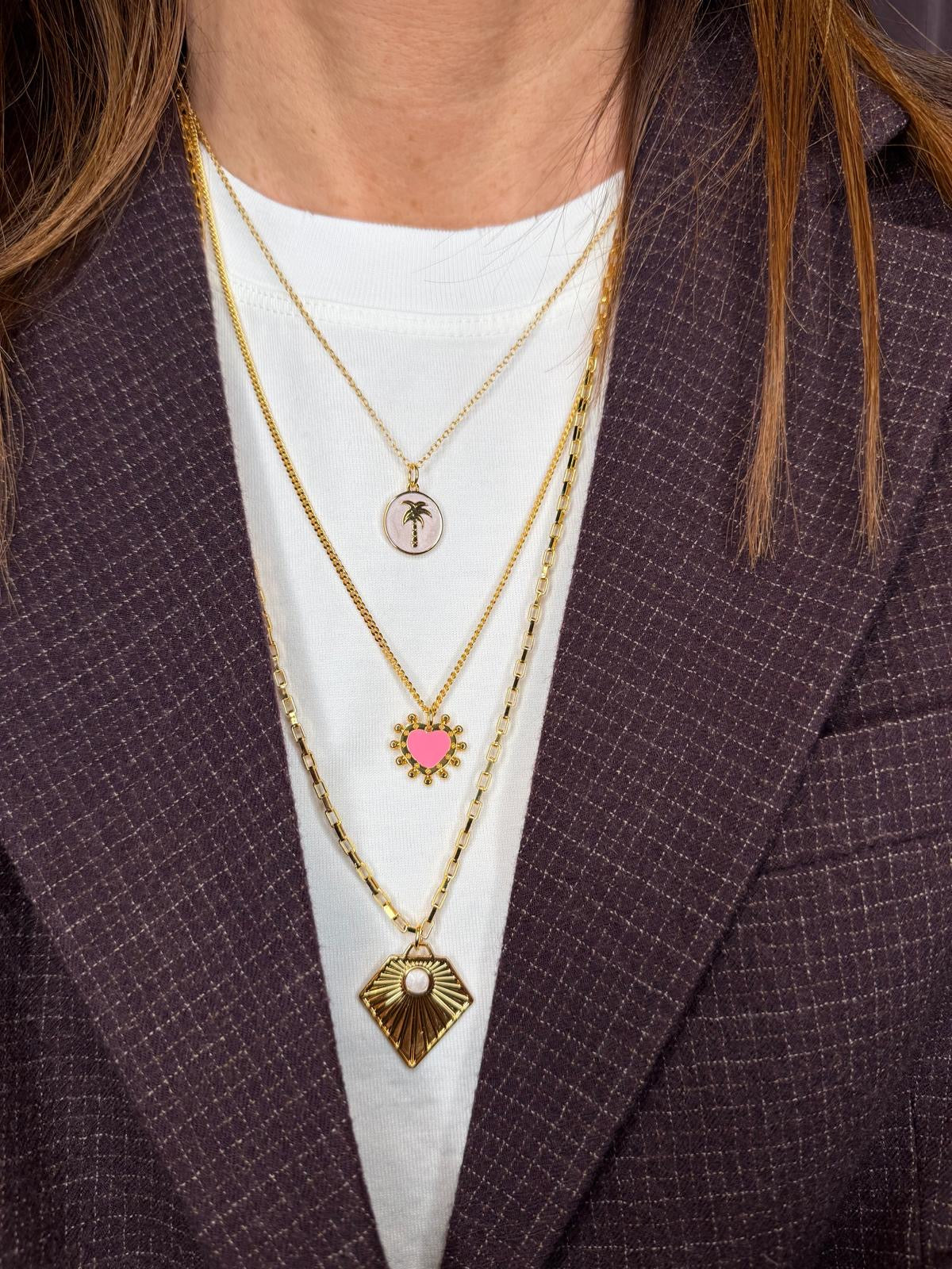 Questa collana è la quintessenza dello stile “Layered” (a strati), un pezzo versatile che risolve da solo l’intero look. Composta da tre catene di diverse lunghezze e lavorazioni, è realizzata in pregiato ottone scelto per la sua resistenza e per la sua capacità di modellarsi in forme sinuose e confortevoli. La sua raffinata finitura in oro 18kt garantisce un colore ricco e prezioso.
